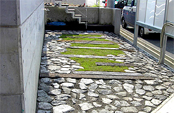 こちらの駐車場はオープンなので杭木と大栗石を敷き、中央部には芝を貼りました。