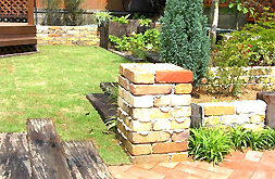 元々あった敷レンガや枕木のふんいきに合わせて、目地をふかせた古レンガ積みにしました。